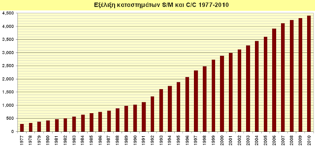 Στο αντίποδα καταγράφονται το 1977 μόλις 290 καταστήματα άνω